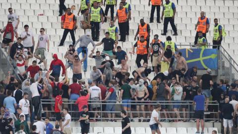 kicked out.Russian hooligans attacked England fans inside the ground after the two teams drew 1-1 on Saturday night.